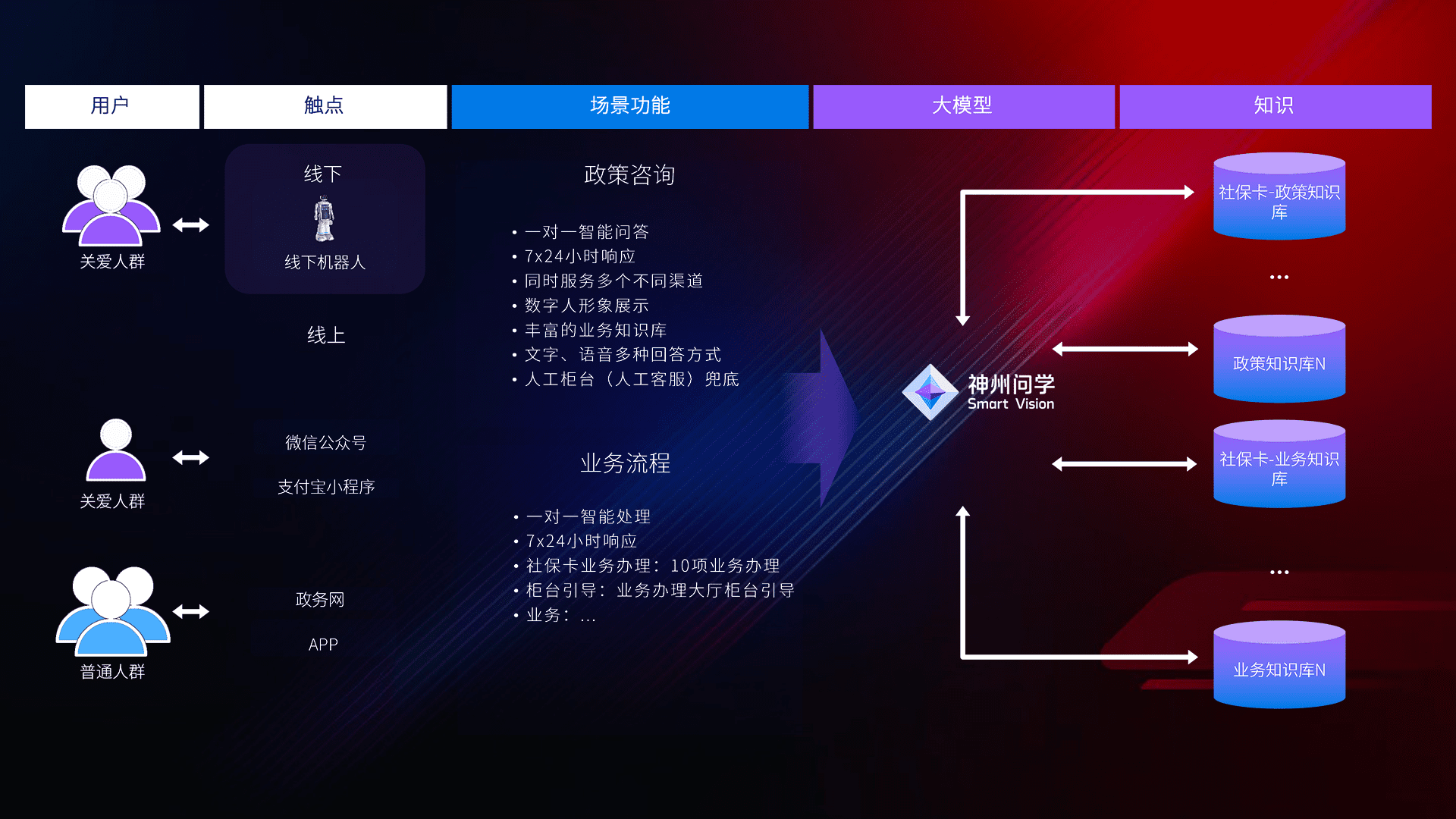 • 利用大语言模型+RAG技术,,,,支持多轮对话,,,,可识别多种同义词、、、、近义词,,,,精准理解关爱人群语义快速输出结果。。。。